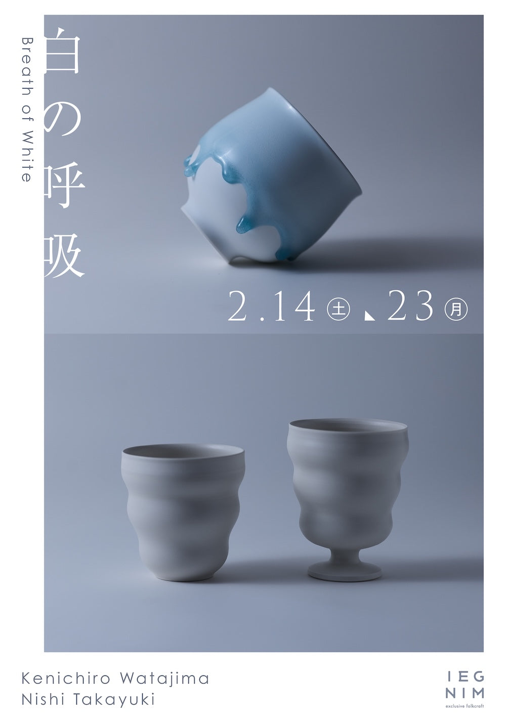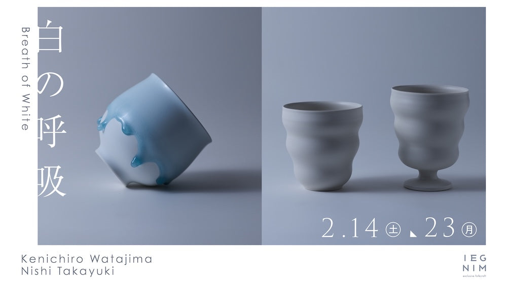 2026年2月14日(土)〜23日(月)の期間、九州を代表する磁器の産地、有田と波佐見町にて白磁の器を制作する西 隆行さんと綿島 健一郎さんによる二人展『白の呼吸』を IEGNIM にて開催いたします。