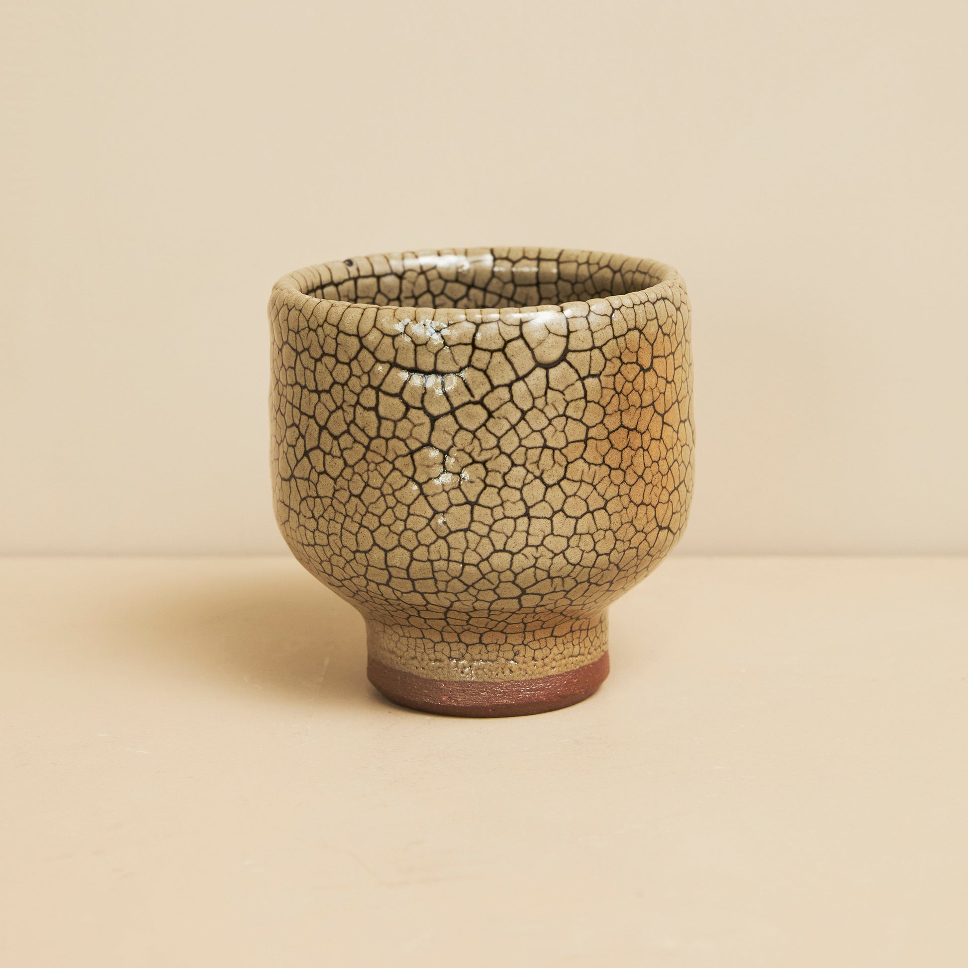 ⿅児島県で江⼾時代から続く「薩摩焼」のひとつである⿓⾨司焼の焼酎カップ。黒蛇蝎釉(くろだかつゆう)という⿓⾨司ならではの釉薬を使用しており、収縮率の異なる釉薬から生まれる、その名の通りへびやサソリのような独特な模様は特別な存在感があります。