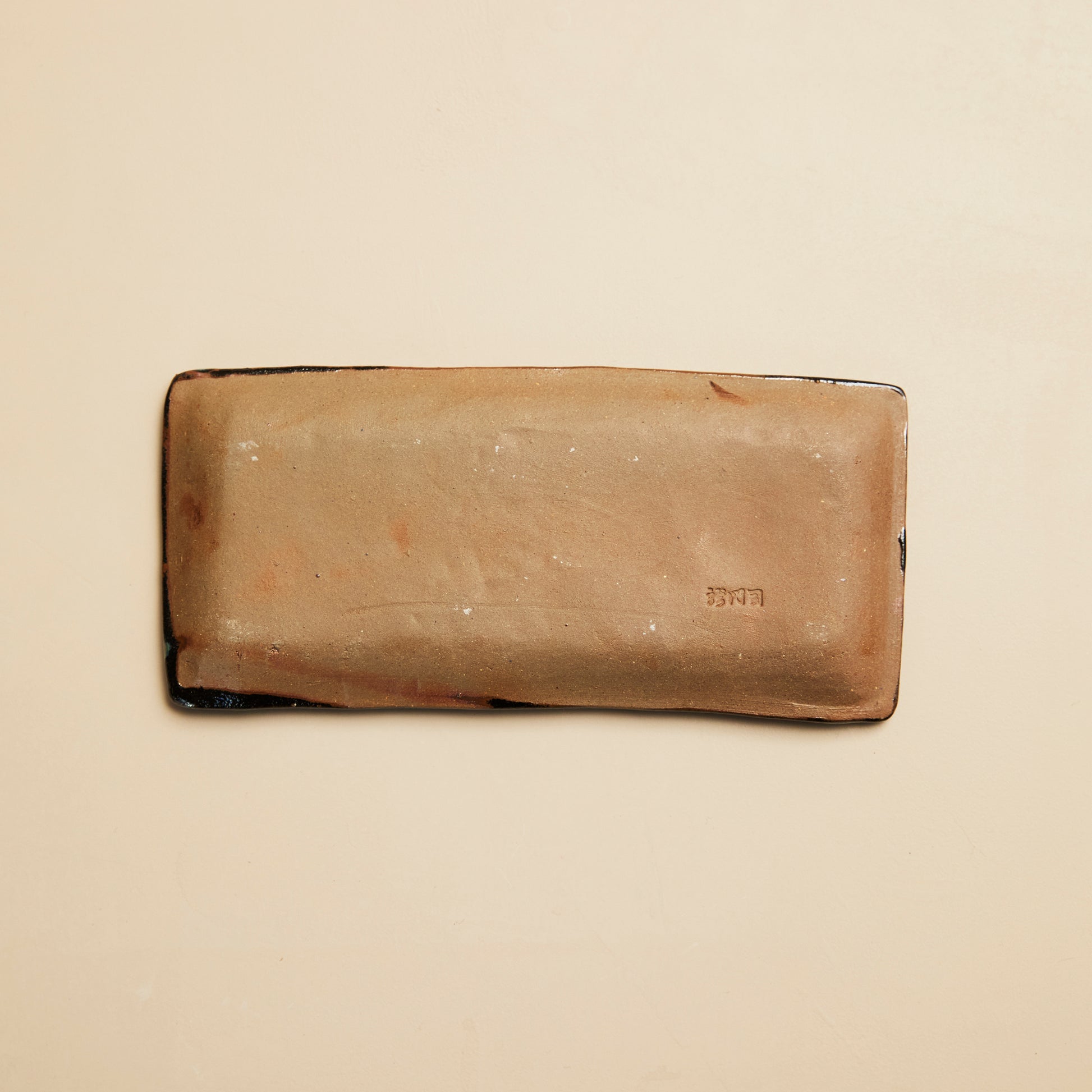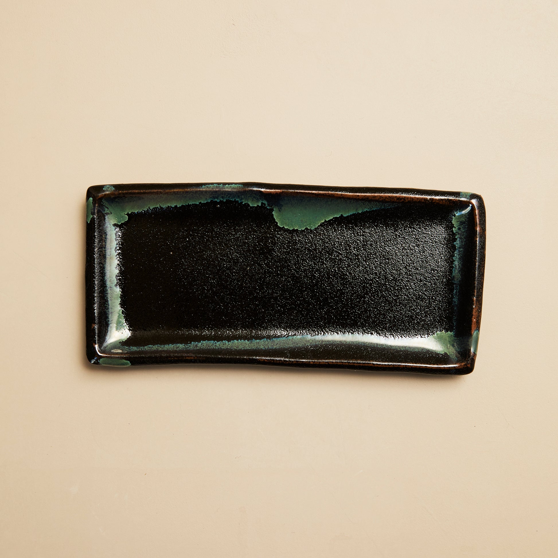 ⿅児島県で江⼾時代から続く「薩摩焼」のひとつである、⿓⾨司焼の角皿。龍門司焼らしい、黒地にエメラルドグリーンのような青の釉薬をフチにあしらっています。お魚をのせるのはもちろん、お寿司などを並べても映えるサイズ。
