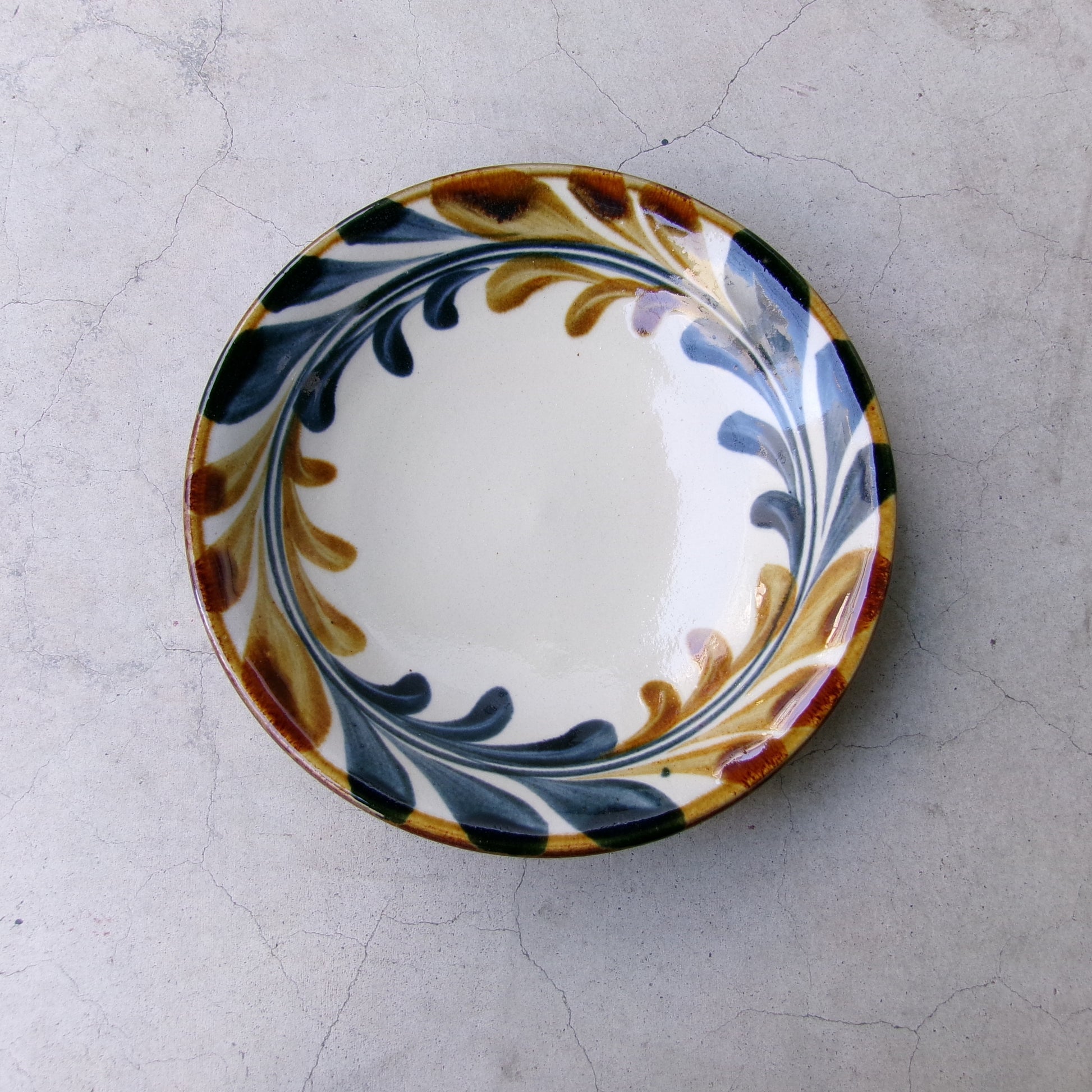 沖縄の壺屋焼(つぼややき)の窯元の一つである、陶眞窯(とうしんがま)作のデイゴ唐草模様の7寸皿。少し深さがあるので用途を選ばずご使用いただけ、カレーやスープパスタなどにもおすすめです。